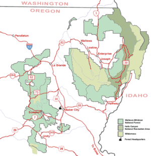 The Wallowa–Whitman National Forest is a United States National Forest in the U.S. states of Oregon and Idaho. Formed upon the merger of the Wallowa and Whitman national forests in 1954, it is located in the northeastern corner of the state, in Wallowa, Baker, Union, Grant, and Umatilla counties in Oregon, and includes small areas in Nez Perce and Idaho counties in Idaho.[3][4] The forest is named for the Wallowa band of the Nez Perce people, who originally lived in the area, and Marcus and Narcissa Whitman, Presbyterian missionaries who settled just to the north in 1836. Forest headquarters are located in Baker City, Oregon with ranger districts in La Grande, Joseph and Baker City.