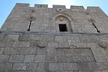 At the northwest corner of the Ottoman wall, archaeologists have discovered the meager remains of a large tower, c. 35x35 metres, probably first built in the 11th century during the Fatimid period, that fell to the Franks at the end of the First Crusade in 1099, and was apparently expanded by the Ayyubids after Saladin's reconquest of the city in 1187.[8] The tower is known in Arabic as Qasr al-Jalud (Goliath's Tower), and to the Crusaders as Turris Tancredi (Latin for Tancred's Tower), after Tancred of Hauteville, the commander whose troops breached the Fatimid defenses at this specific point during the 1099 siege.[8][9] The tower as well as the entire city wall were long destroyed by the time the Ottoman Turks built theirs, possibly since 1219 when Ayyubid ruler Al-Mu'azzam Isa razed most of the city fortifications.[9]