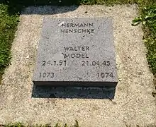 Model's decision ended the war for his men, but he had little desire to witness the aftermath of defeat. He said to his staff before dissolving his command: "Has everything been done to justify our actions in the light of history? What can there be left for a commander in defeat? In antiquity they took poison".[90][94][95] His decision to commit suicide was sealed when he learned that the Soviets had indicted him for war crimes, specifically the deaths of 577,000 people in concentration camps in Latvia and the deportation of 175,000 others as slave labor.[90][93] These acts were committed by the SS and there is no evidence he was aware of them.[90] He shot himself in the head in a forest on 21 April 1945. The site of the event, between Duisburg and the village of Lintorf, is today part of the city of Ratingen.