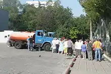 On the day after the tank incursion, three soldiers were killed when they were ambushed by insurgents in Stepanivka.[196] Heavy fighting resumed during the morning of 13 June, when the government launched a new attack against insurgents in Mariupol. Ukrainian troops managed to recapture the city, and declared it the "provisional capital" of Donetsk Oblast until the government regains control over Donetsk city.[197] Meanwhile, an agreement between the Minister of Internal Affairs, Arsen Avakov, and the president of the DPR, Denis Pushilin, meant to create a ceasefire and allow civilians to escape the violence in Sloviansk failed, with both sides blaming each other for launching new attacks.[198] During the next morning, a convoy of border guardsmen was attacked by insurgents while passing Mariupol, leaving at least five of the guardsmen dead.[199]