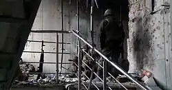 On the morning of 26 May 200 pro-Russian insurgents, including members of the Vostok Battalion, captured the main terminal of the Donetsk International Airport, erected roadblocks around it, and demanded that government forces withdraw.[166] Soon after these demands were issued, the Ukrainian National Guard issued an ultimatum to the separatists, asking them to surrender. This was subsequently rejected. Government forces then launched an assault on separatist positions at the airport with paratroopers and airstrikes.[167] Attack helicopters were also used by government forces. They targeted a separatist-operated anti-aircraft gun.[168] An estimated 40 insurgents died in the fighting, with some civilians caught in the crossfire.[169] Between 15 and 35 insurgents were killed in a single incident, when two lorries carrying wounded fighters away from airport were destroyed in an ambush by government forces.