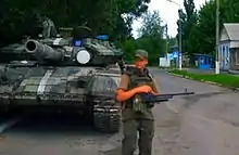 Ukrainian officials said that Russia had allowed tanks to cross the Russo-Ukrainian border into Donetsk Oblast on 11 June. Internal Affairs Minister Arsen Avakov said "we have observed columns passing with armoured personnel carriers, other armoured vehicles and artillery pieces, and tanks which, according to our information, came across the border and this morning were in Snizhne". He continued by saying Ukrainian forces had destroyed part of the column, and that fighting was still under way. Reuters correspondents confirmed the presence of three tanks in Donetsk city, and the US State Department's Bureau of Intelligence and Research also said that Russia had indeed sent tanks, along with other heavy weapons, to the separatists in Ukraine.[190] The weapons sent are said to include: a column of three T-64 tanks, several BM-21 Grad multiple rocket launchers, and other military vehicles. "Russia will claim these tanks were taken from Ukrainian forces, but no Ukrainian tank units have been operating in that area," the State Department said in a statement. "We are confident that these tanks came from Russia."[191] The newly elected Ukrainian president, Petro Poroshenko, said that it was "unacceptable" for tanks to be crossing into Ukraine. Russia called the reports "another fake piece of information."[192] Nevertheless, the three tanks were later spotted moving through Makiivka and Torez, flying the flag of the Russian Federation.[193] Insurgents confirmed that they had obtained three tanks, but leaders refused to elaborate on how they acquired them; one militant told reporters that they originated "from a military warehouse".[194] The president of the DPR, Denis Pushilin, stated that the three tanks would be stationed in Donetsk city, and that they gave his forces "at least some hope of defending [Donetsk] because heavy weapons are already being used against us."[194] Konstantin Mashovets, a former Ukrainian Defence Ministry official, said the tanks had likely been seized by Russian forces in Crimea before making their way into mainland Ukraine. Anton Heraschenko, an advisor to Arsen Avakov, confirmed at a briefing in Kyiv that the tanks were once in the possession of the Armed Forces of Ukraine in Crimea, and that they had been transferred by sea to Russia before crossing the border into Ukraine.[195]