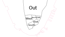 Six wards were established for New York City, which at the time comprised Manhattan and minor outlying islands, on December 8, 1683. Of these, five of the wards were located in what is now the Financial District of Lower Manhattan, while the Out Ward covered the rest of Manhattan.[1] The wards were authorized to elect one alderman and one councilman each.[2] The Dongan Charter of 1686 confirmed these wards, and granted them the ability to elect one alderman, one assistant, and one constable each; the Out Ward was divided into divisions which each elected one constable.[3] The Montgomerie Charter of 1731 added a "Montgomerie Ward" to the north of the West Ward. The wards became numbered in 1791.[4]