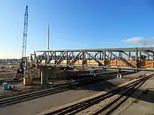 In February 2016, the city approved plans for a cable-stayed pedestrian and bicycle bridge connecting the station mezzanine to a new plaza on the west side of the tracks, to which pedestrian access has been otherwise deemed difficult. The bridge, then planned for completion in 2018, would provide access from the new developments and the adjacent Tesla Factory, which had no convenient pedestrian route to the station because of the rail lines.[24] During the bidding process, the cost of the bridge was increased from $25 million to $35 million, and completion delayed to 2020.[25] Construction began in early 2019, with completion expected in 2020.[26] The main span was put in place in September 2019.[27]