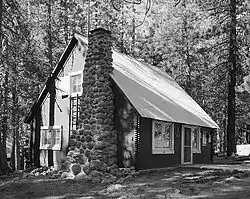 The ranger station is a 1-1/2-story structure, measuring about 24 feet (7.3 m) square. The interior features a large living room measuring 24 feet (7.3 m) by 12 feet (3.7 m), with a stone fireplace. The other two downstairs rooms are a kitchen and a bedroom. There are two rooms in the attic.[2] The steep roof is sheathed with cedar shingles, painted green. The building failed under heavy snow loading the year it was built and was substantially rebuilt in 1927. A renovation in 1999 addressed structural problems arising from the unique construction method, bringing the cabin up to current earthquake code requirements and adding a bathroom in a shed-roofed addition to the rear. Investigation at the time uncovered evidence of a former front porch.[3]