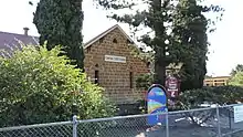 The original school is a single story building, T-shaped in plan and constructed from brown sandstone blocks. The gabled roof is clad in corrugated iron sheeting and is set with pairs of dormer windows on each side of the roof. Each dormer is composed of four single paned casements.[1]