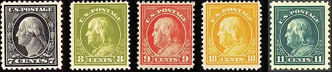 The Washington–Franklin Issues are a series of definitive U.S. Postage stamps depicting George Washington and Benjamin Franklin, issued by the U.S. Post Office between 1908 and 1922. The distinctive feature of this issue is that it employs only two engraved heads set in ovals—Washington and Franklin in full profile—and replicates one or another of these portraits on every stamp denomination in the series. This is a significant departure from previous definitive issues, which had featured pantheons of famous Americans, with each portrait-image confined to a single denomination. At the same time, this break with the recent past represented a return to origins. Washington and Franklin, after all, had appeared on the first two American stamps, issued in 1847, and during the next fifteen years, each of the eight stamp denominations available (with one exception) featured either Washington or Franklin.