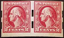 Three denominations of 1, 2 and 3-cents were printed by the offset printing process. There are two types of the 1-cent denomination, five different types of the 2-cent variety, and two types of the 3-cent variety. These types possess differences in the lines on the toga rope in Washington's profile and usually require the aid of magnification to positively identify their different characteristics. Stamps produced by the offset process were issued with a perforation gauge of 11 with the one exception of the 1919 1-cent issue with gauge 12½. The first Washington–Franklin stamp printed by the offset process was a 3-cent Washington-head, issued on March 22, 1918. The 1-cent green followed and was issued on December 24, 1918. The five types of the 2-cent denomination were issued sometime later on March 15, 1920. Beginning in 1919 an imperforate variety (no perforations between stamps) was also issued. All three denominations were printed and possess the same variations in type that are found on the perforated issues, as the imperforate issues were produced from the same plates. There were no Franklin-heads printed with the Offset printing press.[1][3]