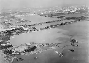 The field was dramatically enlarged (and the shoreline of the Potomac River altered) in April 1928.[33] Safety improvements were also made. Arlington Beach amusement park was purchased and razed; three new runways built on the theme park grounds; a new paved runway planned for the existing airport; and a new terminal, hangar, and office building constructed.[34] Arlington County commissioners also banned the burning of trash at the landfill next to Hoover Field in mid-1932 (but not the one next to Washington Airport).[27] In May 1932, the airport paid local electric power and telephone companies to bury their lines obstructing the landing and take-off lanes.[35][36] But numerous other safety issues remained.