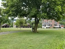 Ridgedale was the scene of activity during the American Civil War.[4][5] Companies of cavalry camped in the yard, which they dubbed "Camp Washington."[4][9] The Washington family hid Confederate soldiers in the house.[4] Early in Summer 1861, Confederate General Turner Ashby and his command occupied a position on the South Branch Potomac River "upon the estate of Col. George Washington."[5][9][10] According to Washington family tradition, General Ashby had his headquarters at or near Ridgedale.[5][10] As a compliment to George W. Washington, Ashby named his headquarters "Camp Washington."[10] His brother, Captain Richard Ashby, was carried on a litter to the Washington home at Ridgedale after he was mortally wounded at the Battle of Kelley's Island on June 28, 1861.[4][5][9][11] Another account places Captain Ashby's mortal wounding by a bayonet thrust at a battle with Union forces at Dans Run along the Baltimore and Ohio Railroad on June 26, 1861.[3][5][11][12] He was placed in a room associated with Ridgedale's ballroom and died there after about a week.[4][5][11] He was cared for until he died on July 3, 1861.[3][4][5][9][11] At his request, he was supposedly buried under an oak tree at the Indian Mound Cemetery in Romney.[4][5] After the war, he was reinterred with his brother Turner Ashby at Stonewall Cemetery in Winchester, Virginia, in 1866.[4][5] Their grave is marked "The Brothers Ashby."[4][5]
