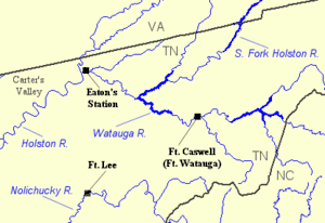 Immediately after the news of the second petition was made known, the Cherokee—from whom the district had originally leased the settlement's land, but who had now allied themselves with the British—launched an all-out invasion against the district, but were soundly defeated. In 1777, the Cherokee signed the Treaty of Long Island, effectively ceding control of the Watauga and Nolichucky valleys to North Carolina.[6] Chief Dragging Canoe (eventual leader of the Chickamauga Cherokee), and his followers, however, vowed to continue to fight.