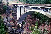 The highway leaves the Clallam River and reaches the foothills of Burnt Mountain at a junction with SR 113, which travels south to US 101 at Sappho. SR 112 turns east to follow the Pysht River through another valley that leads towards the strait, rejoining the coast at Pysht near Pillar Point. The highway continues southeast along the coastal bluffs, making hairpin turns to cross several creeks as they empty into the strait. After passing Twin Beach, SR 112 moves further inland and follows a former railroad grade the passes through a rural plain with several communities, including Disque, Joyce, and Ramapo near the Salt Creek Recreation Area. SR 112 passes near the Lower Elwha Indian Reservation and then turns south to cross the Elwha River gorge on a 564-foot-long (172 m) deck arch bridge.[6] An interpretive center was built near the bridge in 2016 as part of the Elwha River dam removal and restoration project.[7] The highway ends after the bridge at an intersection with US 101 west of Port Angeles and William R. Fairchild International Airport.[3][5]
