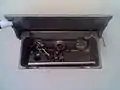 "The approximately five pound circular watchclock was enclosed in a black leather pouch attached to a leather strap and carried over the shoulder. Inside buildings mounted near doors, were watchclock stations consisting of a small metal box with a hinged lid, which contained a numbered key affixed by a twelve-inch chain. The watchman would insert the key into the clock, rotate it and a numeric stamp would be pressed onto a roll or disk of paper locked inside the clock."