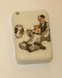 A water-dropper (Japanese: 水滴, Hepburn: suiteki, Chinese: 水滴; pinyin: shuǐdī) is a small device used in East Asian calligraphy as a container designed to hold a small amount of water. In order to make ink a few drops of water are dropped onto the surface of an inkstone. By grinding an inkstick into this water on the inkstone, particles come off and mix with the water, forming ink.