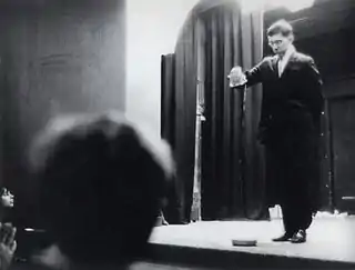 Yam was a name thought up by Brecht and Watts in late 1962 to act as an umbrella project 'for all manner of immaterial, experimental, as yet unclassified forms of expression.'[9] Specifically intending to provide a platform for 'art that could not be bought,' the earliest Yam events involved mailing event cards and other objects stamped with the word 'Yam', or variations, to friends. Designed to increase anticipation, the project reached a head with a month-long series of events in May, 1963, in New York, Rutger's University and George Segal's farm. The Yam Festival was held on a farm in South Brunswick, New Jersey on 19 May 1963 to actions and happenings by artists including Dick Higgins, Allan Kaprow, La Monte Young, and Wolf Vostell. The festival was organised as a wide ranging series of events taking place throughout the month, whose main objective was to bypass traditional gallery outlets, giving artists and 'receivers' greater freedom. Wolf Vostell made here his happening TV Burying.[10]