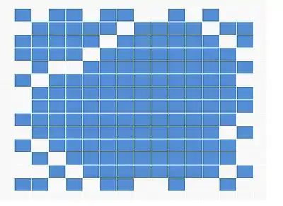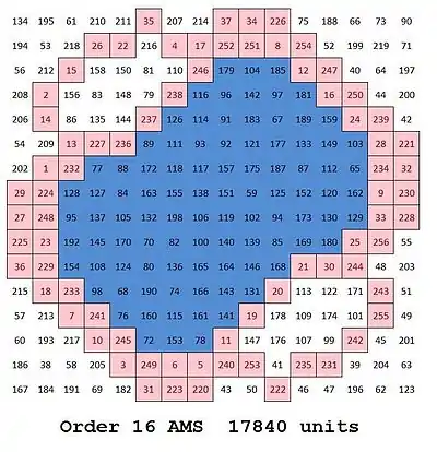 16 x 16 associative magic square retaining 17840 units. The lake in the first image looks a little uglier than common. Jarek Wroblewski notes that good patterns for maximum retention will have equal or near equal number of retaining cells on each peripheral edge ( in this case 7 cells on each edge) [3] The second image is doctored, shading in the top and bottom 37 values.