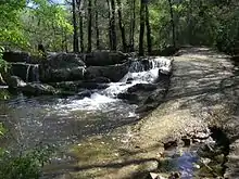 The land at Waters Park was originally owned by Silas and Parthenia Summers who purchased the land in 1872.[1] Right-of-way was sold to Austin and Northwestern Railroad in October 1881. The railroad built a park with a swimming pool, gazebo, baseball field, picnic grounds, and concessions stands in the summer of 1882.[1] The area's railroad tracks were used to transport pink granite from Granite Mountain to the Texas State Capitol in Downtown Austin.[1] Due to a bend in the tracks, trains would occasionally derail, accidentally dumping some of the pink granite.[2] The rocks which remain are a local point of interest. The local post office opened in 1883 and closed in 1905.[1]