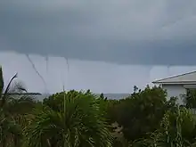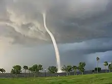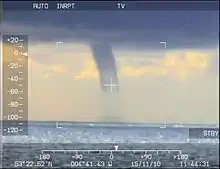 A waterspout is an intense columnar vortex (usually appearing as a funnel-shaped cloud) that occurs over a body of water.[1] Some are connected to a cumulus congestus cloud, some to a cumuliform cloud and some to a cumulonimbus cloud.[2] In the common form, it is a non-supercell tornado over water.[2][3][4]