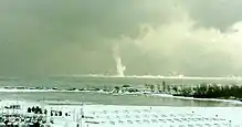 A winter waterspout, also known as a snow devil, an icespout, an ice devil, a snownado, or a snowspout, is an extremely rare instance of a waterspout forming under the base of a snow squall.[20][21] The term "winter waterspout" is used to differentiate between the common warm season waterspout and this rare winter season event. Very little is known about this phenomenon and only six known pictures of this event exist to date, four of which were taken in Ontario, Canada. There are a couple of critical criteria for the formation of a winter waterspout. Very cold temperatures need to be present over a body of water warm enough to produce fog resembling steam above the water's surface. Like the more efficient lake-effect snow events, winds focusing down the axis of long lakes enhance wind convergence and likely enhance their development.[22]