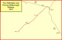 The rival proposal was announced on 12 May 1868: a railway branch line was to link Watlington with Princes Risborough, on the former Wycombe Railway, now taken over by the Great Western Railway. Princes Risborough was a junction for the main line to Oxford via Thame, and a branch to Aylesbury. Events moved swiftly and the Watlington and Princes Risborough Railway received the Royal Assent on 26 July 1869.[4]