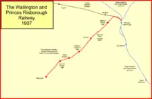 The stations were at Princes Risborough, Chinnor, Aston Rowant and Watlington. The Princes Risborough station was a short wooden platform adjacent to, but separate from the GWR station.[note 1][3][4]