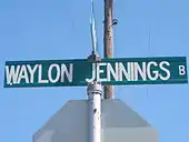 Jennings's music was characterized by his powerful rough-edged singing voice, phrasing and texture.[102][103] He was also recognized for his "spanky-twang" guitar style. To create his sound, he used a pronounced 'phaser' effect (see 'Modulation Effects': below) plus a mixture of thumb and fingers during the rhythmic parts, while using picks for the lead runs. He combined hammer-on and pull-off riffs, with eventual upper-fret double stops and modulation effects.[104] Jennings played a 1953 Fender Telecaster, a used guitar that was a gift from The Waylors. Jennings's bandmates adorned his guitar with a distinctive leather cover that featured a black background with a white floral work.[105][106] Jennings further customized it by filing down the frets to lower the strings on the neck to obtain the slapping sound.[107][108] Among his other guitars, Jennings used a 1950 Fender Broadcaster from the mid-1970s, until he gave it to guitarist Reggie Young in 1993.[109] The leather covers of his guitars were carved by leather artist Terry Lankford.[110]