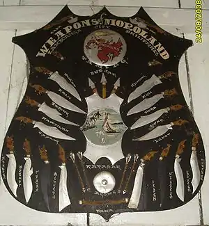 "Weapons of Moroland" is a plaque or crest containing miniature models of weapons used by warriors from the indigenous peoples of Mindanao in the Philippines. As a souvenir, it is fairly common in gift shops, and is considered a pop culture icon.[1] Displaying the plaque in one's home is one of several indications of "how Filipino" one is. It is jokingly used as a description of resistance to colonialism.[2]