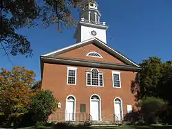 The town's first church was built near the minister's house in 1787, and was destroyed by fire in 1821. The town responded by building the brick Federal style meeting house, located southeast of the Foster House across Weathersfield Center Road. This building was built to serve both as a religious sanctuary and to house town meetings. It is a restrained example of late Federal architecture, with round-headed door openings on the ground floor, a Palladian window above the central entrance, and a fully pedimented gable above with an arched eyebrow window at its center. Rising from its roof is a multi-stage tower, starting with a square stage featuring a multilight oculus window, an open octagonal belfry above that, and a louvered cupola at the top. The building's gallery was converted to a full second floor in 1861 to formalize the separation of church and state, with the sanctuary on one level and town facilities on the other.[2]