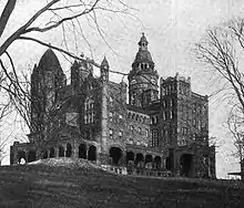 Webb commissioned New York architect Arthur P. Jennings to design a building for the institution to be built on 14 acres (5.7 ha) of land on a bluff overlooking the Harlem and Hudson rivers in the Bronx. Construction commenced in 1890 and was completed in 1893. The building was designed in the Romanesque Revival style and was built of New York brownstone. It was intended to be "a romantic version of a medieval castle", with turrets, fanciful carving, and other flourishes.[2] This facility was used for 50 years.