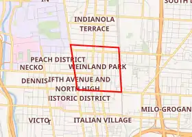 Weinland Park is located North of Downtown Columbus and East of The Ohio State University. It is bounded on the north by Chittenden Avenue, the south by Fifth Avenue, the east by the existing railroad tracks, and the west by North High Street and it covers approximately 217 acres of land.[8] It is one of thirteen neighborhoods within the University District.[9]