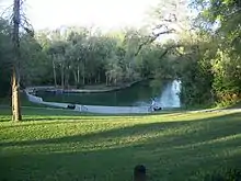 The headwater of the Wekiva River is the Wekiwa Springs, a second-magnitude spring located within the Wekiwa Springs State Park in Apopka. The spring has a mean discharge of 66.5 cu ft/s (1.88 m3/s) or 5,745,600 cubic feet (42,980,000 US gal) per day emanating from two vents, the largest of which is 35 by 5 ft (10.7 by 1.5 m) located 15 ft (4.6 m) under the water. A weir located about 270 ft (82 m) from the springs forms a 200-by-100-foot (61 by 30 m)-wide pool for swimming. At 170 ft (52 m) from the weir, the river widens into a trapezoidal pool about 430 ft (130 m) at its widest. The clear, bluish-green water narrows into a 60-foot (18 m)-wide run as it flows northeastward.[13][14]