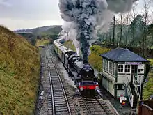 Much of this activity ended with the withdrawal of local stopping trains on the Carnforth line in 1960 (though it remained in use for through services) and the closure of the Lancaster line to passengers in January 1966.[3] The latter was then closed to all traffic the following year and subsequently lifted, although the abandoned trackbed can still be seen. The original station buildings have also been demolished and replaced by shelters, although the signal box remained in use as the last remaining block post on the line until 1988 – it was then closed & permanently "switched out" but was not formally abolished and removed until 2006.