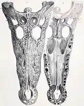 Compared to the Nile Crocodile, the West African Crocodile is smaller: Adults are typically 1.5–2.5 m (5–8 ft) long, and maximum is perhaps 3–4 m (10–13 ft).[4] The species was named by Étienne Geoffroy Saint-Hilaire in 1807, who discovered differences between the skulls of a mummified crocodile and those of Nile crocodile (C. niloticus). This new species was, however, for a long time afterwards regarded as a synonym of the Nile crocodile. In 2003, a study indicated that C. suchus was a valid species,[2] and this was confirmed by several other studies in 2011–2015.[5][6][7] Despite the long history of confusion, genetic testing has revealed that the two are not particularly close. The closest relatives of the Nile crocodile are the Crocodylus species from the Americas, while the West African crocodile is basal to the clade of Nile and American crocodiles.[8]