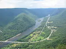 The West Branch Susquehanna River is one of the two principal branches, along with the North Branch, of the Susquehanna River in the northeastern United States. The North Branch, which rises in upstate New York, is generally regarded as the extension of the main branch,[4] with the shorter West Branch being its principal tributary. The West Branch, which is 243 miles (391 km) long,[5] is entirely within the state of Pennsylvania, draining a large mountainous area within the Allegheny Plateau in the western part of the state. Along most of its course it meanders past mountain ridges and through water gaps, forming a large zigzag arc through central Pennsylvania around the north end of the Allegheny Mountains. In colonial times the river provided an important water route to the Ohio River valley. In the 18th century, its lower valley became a significant industrial heartland of Pennsylvania. In the 20th century, the upper reaches of the West Branch turned a yellow/orange color due to sulfurous drainage from nearby and abandoned deep bituminous coal mines.