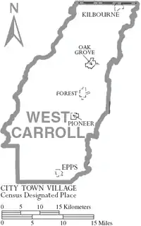 West Carroll Parish (French: Paroisse de Carroll Ouest) is a parish located in the northeastern part of the U.S. state of Louisiana. As of the 2010 census, the population was 11,604.[1] The parish seat is Oak Grove.[2] The parish was founded in 1877, when Carroll Parish was divided.[3]