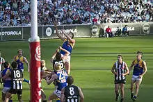John Worsfold replaced Steve Malaxos as captain for the 1991 season, and the club finished the season as minor premiers for the first time, losing only three games.[4] In the finals series, West Coast progressed to the grand final, but were defeated by Hawthorn by 53 points. Peter Sumich kicked 111 goals during the season, becoming the first West Coast player to reach a century of goals, as well as the first-ever left-footer.[11] In 1992, West Coast finished fourth on the ladder, but again progressed to the grand final, defeating Geelong by 28 points to become the first team based outside Victoria to win a premiership.[12] Having slipped to third in 1993, the club finished as minor premiers the following season, and went on to again defeat Geelong in the grand final to win its second premiership in three years.[13] In 1995, a second AFL team based in Western Australia, the Fremantle Football Club, with the two clubs' subsequent rivalry branded as the "Western Derby".[14] West Coast made the finals in every year that remained in the 1990s, but failed to reach another grand final, with a fourth-place finish in 1996 their best result.[8] Worsfold retired at the end of the 1998 season, and was replaced by his vice-captain, Guy McKenna, who served as captain until his retirement two seasons later.[15]