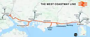 The West Coastway line runs almost alongside or within a few miles of the south coast of Sussex and Hampshire, between Brighton and Southampton.[1][2][3]