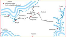 The main line was in new construction from Penzance to a point near Trenowin Farm, east of Angarrack, then using the Hayle Railway route to near the Redruth station, but with a short new section to by-pass the Penponds inclined plane. From Redruth there was new construction (with a new, more central station at that town) to a terminal station about a mile west of Truro. This was at Higher Town, but its official name was Truro Road,[8][9][10] although MacDermot uses the name Higher Town.[3]