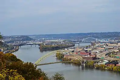 The West End Bridge is a steel bowstring arch bridge over the Ohio River in Pittsburgh, Pennsylvania, approximately one mile below the confluence of the Allegheny and Monongahela Rivers. The bridge was built from 1930 to 1932 primarily by the American Bridge Company (superstructure) and the Foundation Company (substructure) and was the world's first to use tied-arch technology on a large scale.[6] It connects the West End to the Chateau neighborhood on the North Side of Pittsburgh. The bridge was placed on the National Register of Historic Places in 1979, and the List of Pittsburgh History and Landmarks Foundation Historic Landmarks in 2001. As of 2016, the bridge and its surrounding approaches are undergoing some major reconstruction.