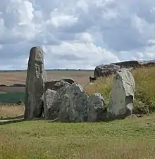 During the third millennium BCE sarsen boulders and earth were used to partially block the forecourt.[39] In the late third millennium BCE, a façade of three large sarsen stones was erected across the forecourt, blocking any further entrance to the chamber.[39] This act may have been roughly contemporary, or slightly later, than the main stone phases at the Avebury stone circle and the Sanctuary.[39] This is the period in which archaeologists begin referring to the end of the Late Neolithic period and the start of the Early Bronze Age.[40]