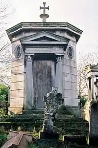 The iron monument of Grissell on left, grade II, the granite and limestone mausoleum of Alexander Berens by E.M. Barry on right, grade II*