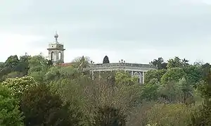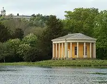 The park still contains many follies and temples. The "Temple of Music" is on an island in the lake, inspired by the Temple of Vesta in Rome. It was designed for Dashwood's fêtes champêtres,[36] with the temple used as a theatre; the remains of the stage survive.[37] Opposite the temple is the garden's main cascade which has statues of two water nymphs. The present cascade has been remade, as the original was demolished in the 1830s. An octagonal tower known as the "Temple of the Winds" is based in design on the Tower of the Winds in Athens.[38]