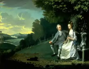 Sir Francis Dashwood built West Wycombe to entertain, and there has been much speculation on the kind of entertainment he provided for his guests. Judged against the sexual morals of the late 18th century, Dashwood and his clique were regarded as promiscuous; while it is likely that the contemporary reports of the bacchanalian orgies over which Dashwood presided in the Hellfire caves above West Wycombe were exaggerated, free love and heavy drinking did take place there.[45] Dashwood often had himself depicted in portraits in fancy dress (in one, dressed as St Francis of Assisi toasting a statue of Venus[45]), and it is his love of fancy dress which seems to have pervaded through to his parties at West Wycombe Park. Following the dedication of the West portico as the temple of Bacchus in 1771, Dashwood and his friends dressed in skins adorned with vine leaves and went to party by the lake for "Paeans and libations".[46] On another occasion, during a mock sea battle on the canal, the captain of the snow, "attacking" a battery constructed on the bank, was struck by the wadding of a gun and suffered an internal injury.[47] Dashwood later devoted more of his time to political reform and to charitable works; he had an active political career all of his adult life; a serious occupation belied by his reputation for revelry. He died in 1781, bequeathing West Wycombe to his half-brother Sir John Dashwood-King, 3rd Baronet.[48]