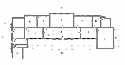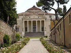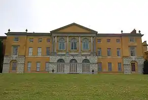 The façade, which has similarities to the main façade of Palladio's Palazzo Chiericati of 1550, was originally the entrance front. The front door is still in the centre of the ground floor leading into the main entry hall.[19] This is a substantial deviation from the classical form of English Palladianism in which the main entrance and principal rooms would be on the first floor reached by an outer staircase, giving the main reception rooms elevated views, with the ground floor given over to service rooms. Such a radical re-arrangement was not possible here since the house was a partial rebuild rather than a wholly new structure.[20]