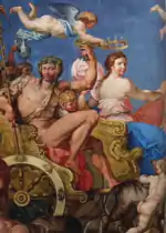 Many of the reception rooms have painted ceilings copied from Italian palazzi, most notably from the Palazzo Farnese in Rome. The largest room in the house is the Music Room, which opens onto the east portico. The ceiling fresco in this room depicts the "Banquet of the Gods" and was copied from the Villa Farnesina.[23] The Saloon, which occupies the centre of the north front, contains many marbles, including statuettes of the four seasons. The ceiling depicting "The Council of the Gods and the Admission of Psyche" is also a copy from Villa Farnesina.[24]