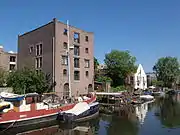 Reael gave credit to ship carpenters, who did not have to pay rent for the first twelve years, but had to deliver a ship. He also had houses built on the island, which the city opposed.[7] The Tar Company of Joseph Deutz got a large yard on the Realen Island in 1664.[8] Until 1673 there was also a peat market. Sand was stored on the Zandhoek, which was used as ballast and for raising streets and neighborhoods in the center. As early as 1676 there was a brandy distillery at the Drieharingenbrug, called De drie gecroonde haringen (The three crowned herrings). These business premises were demolished around 1780 by shipbuilder Haring Booy and rebuilt as a sort of country house.[9] For many years, the tobacco firm British American Tobacco was established on Realeneiland. The island became known through the books of Jan Mens about the Golden Reael. There are still thirteen impressive captain's houses.