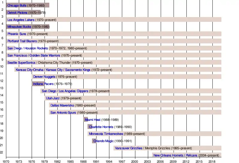 | Chicago Bulls | Chicago, Illinois | 1970 | Western Division | 1980 | Eastern Conference | Eastern Conference |