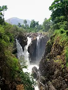 The Western High Plateau's relief and high rainfall make it a major watershed for Cameroon.[9] Important rivers in the region include the Manyu, which rises in the Bamboutos Mountains and becomes the Cross River on its lower course, and the Nkam, which is known as the Wouri River on its lower course.[7] The region gives rise to important tributaries to the Sanaga River.[10] These rivers follow a Cameroon regime, a subtype of the equatorial regime of other southern Cameroonian rivers. This means that the rivers experience a long, high-water period during the wet season and a short, low-water period during the dry season.[11] The region's rivers ultimately empty into the Atlantic Ocean.[9] The area's accidented geography gives rise to several waterfalls along these waterways. Ekon Falls near Nkongsamba in the West Region is 80 metres high.[12] Crater lakes dot the plateau, the result of dead volcanoes filling with water.[2]