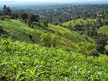 The plateau experiences an equatorial climate of the Cameroon type. The area experiences two major seasons: A long, wet season of nine months, and a short, dry season of three months. During the wet season, humid, prevailing monsoon winds blow in from the west and lose their moisture upon hitting the region's mountains. Average rainfall per year ranges from 1,000 mm to 2,000 mm.[6] High elevations give the region a cooler climate than the rest of Cameroon. For example, the average temperature at Dschang in the West Region is 20°C.[7] Toward the north, rainfall levels are reduced as the Sudan climate becomes predominant.[8]