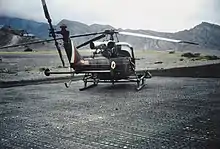 Behind the two front seats was a three-seat bench, although this could be replaced with a four-seat bench when fitted with modified rear doors. It was used for general light work, including observation, liaison, training and search & rescue. When fitted as a light attack helicopter, it carried either two, skid-mounted, forward-firing machine gun (L8A1 General Purpose Machine Gun) packs or a single pintle-mounted machine gun in the rear cabin.[4] The pintle mount was available in both port and starboard mountings.[5] The gun-packs, which were both aimed at a pre-set convergence angle, carried 200 rounds of ammunition and were mounted on a tubular spar that was fixed between the front and rear undercarriage legs.[6] In the anti-tank role, it could carry four guided missiles (the Nord SS.11).[7] The sighting unit was the AF.120, the result of a joint venture between Avimo and Ferranti, had x2.5 and x10 magnification.[8] The APX Bezu sight unit was also evaluated but rejected, although it was adopted for use on the Westland Wasp.